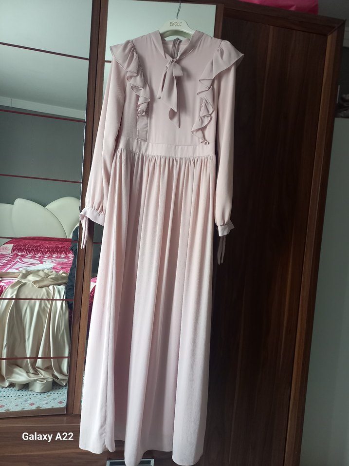 Uzun kollu, yüksek yakalı ve volan detaylı bej renkli, yumuşak sentetik kumaştan yapılmış bol kesim bohem tarzda elbise, düğün için uygundur aynı renkte Şallı da hediyedir bilgi almak için yazabilirsiniz