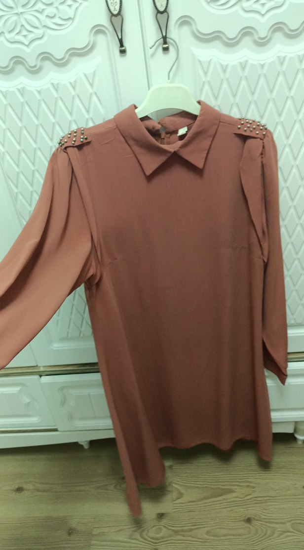 uzun kollu, yakalı bu tunik, omuzlarında düğme detaylarına sahiptir. Gevşek kesimi ve parlak, ipeksi kumaşıyla gündelik sokak stiline uygundur.