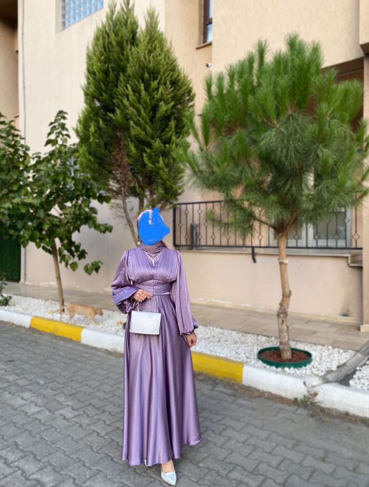Uzun kol ve yüksek yakalı mor abiye elbise, bol kesim ve drapeli detaylara sahiptir. Düğünler için uygun, sade ve mütevazı bir tarza sahiptir. ✨ 1 defa kınada kullanıldı. Hiçbir hasarı yoktur. Boy 1,57 - kilo 46 tam