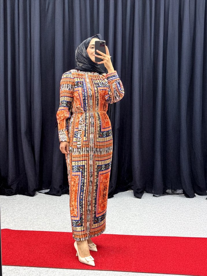 Uzun kollu, yüksek yakalı ve salaş kesimli bu elbise çok renkli batik desenlidir. Yumuşak sentetik kumaştan üretilmiş, günlük kullanıma uygundur.