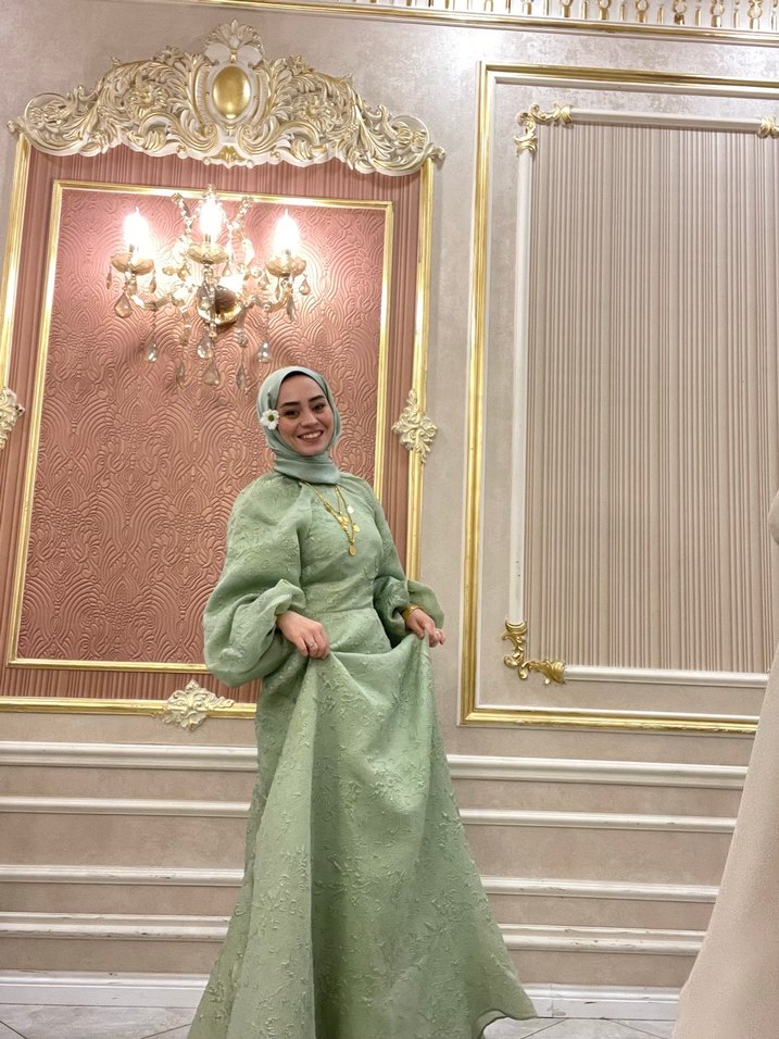 Modest, regular kesim, uzun kollu, yüksek yakalı, drapeli, pastel haki renkte etnik desenli kadın abiye. Düğün için uygundur.