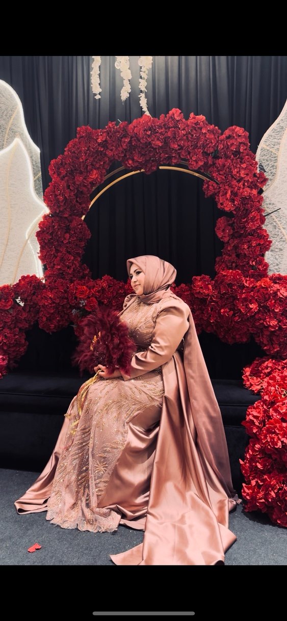 Camel renginde, uzun kollu ve yüksek yakalı kadın abiyesi. Etnik desenli, bol kesim ve drapeli tasarımıyla düğünler için uygun, gösterişli ve sade bir modeldir.