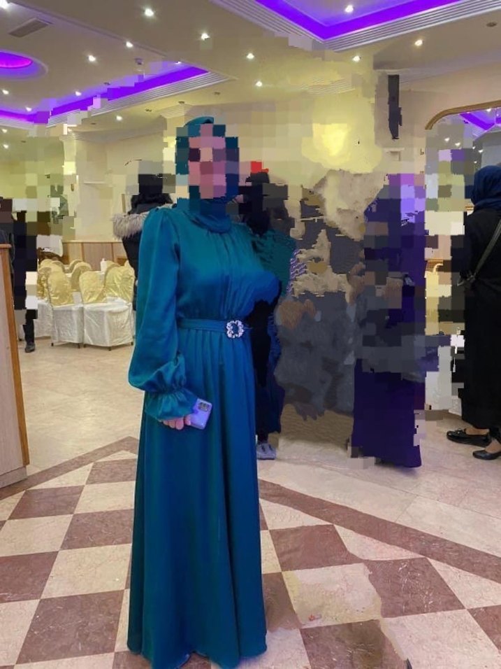 Uzun kollu, yüksek yakalı ve kemerli bu turkuaz elbise, sade ve düzenli kesime sahiptir. Bir kaç yerinde çok gözükmeyen lekeler var