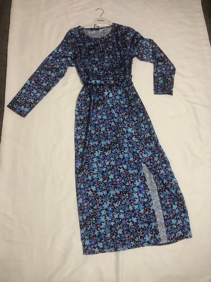 Uzun kollu, bol kesim ve drapeli tasarıma sahip kadın elbisesi. Sentetik kumaştan, koyu çok renkli batik desenli, yuvarlak yakalı, günlük kullanım için uygun kemerli bohem tarz