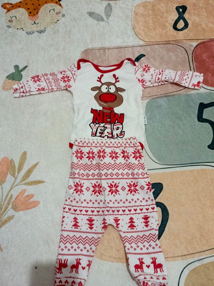Uzun kollu, yuvarlak yakalı, örgü dokulu ve renkli baskılı beyaz kışlık bebek takımı. Üstünde geyik ve "NEW YEAR" yazısı bulunur.
