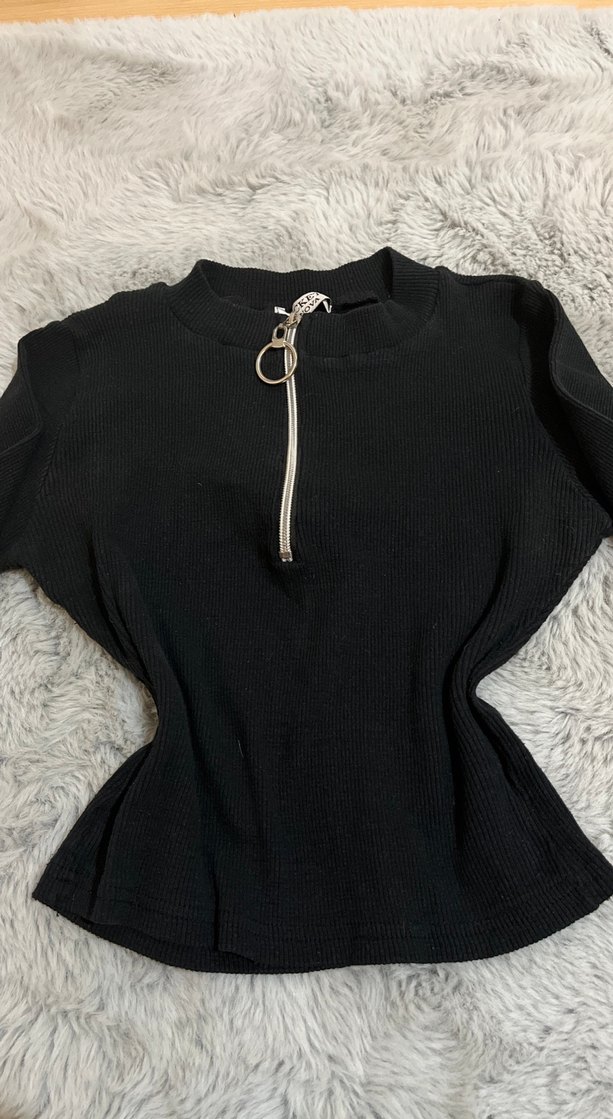 Dar kesim, yüksek yakalı kadın kazak, fermuarlı ön detaya sahiptir. Yumuşak sentetik kumaştan yapılmış, kısa kollu ve normal midi boydadır. Siyah renk ve gri fermuar detayı goth tarzını yansıtır.