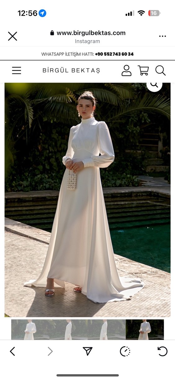 Yüksek yakalı ve uzun kollu, klasik ve zarif kesime sahip uzun saten beyaz gelinlik. Birgül Bektaş imzası taşıyan modern klasik tasarım. Nikahım için almıştım bir kez kullanıldı.