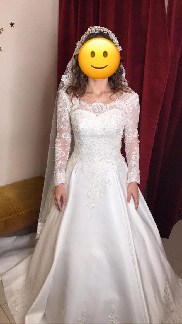 A kesim, 36 beden, kayık yaka, mat saten, Fransız güpürlü, sırt dekolteli, kuyruklu, uzun kollu(çıkarılabilir) gelinlik. - 36/34 bedene uyumlu, sırtı ayarlanabilir ipli. - Etek kumaşı parlama yapmayan kalın, mat saten. - Eteğin iç kısmında bir kat saten daha var, bu sayede tarlatan izi göstermiyor. - Kolları çıkarılıp kalın askılı şekilde kullanılabilir. - Sırt kısmındaki iplerin altı, kapak ile kapatılabilir. Boyu uzun 175 boyuna kadar kullanılabilir. 160 boy, 49 kg iken giydim. İzmir Bornova gelip deneyip öyle satın alabilirsiniz.