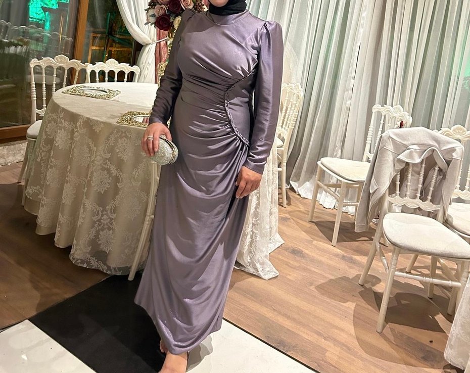 Yüksek yakalı ve uzun kollu, vücuda oturan uzun abiye elbise. Modern klasik tarzıyla düğün ve özel günler için uygundur.