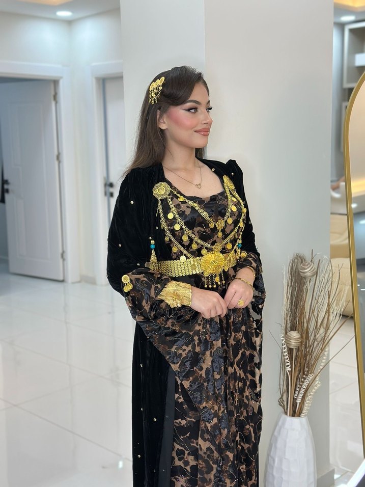 Uzun, bol kesim bu hint elbisesi etnik desenler ve altın boncuk detaylarına sahiptir. Straplez yaka ve uzun kolludur, düğünler için uygundur.