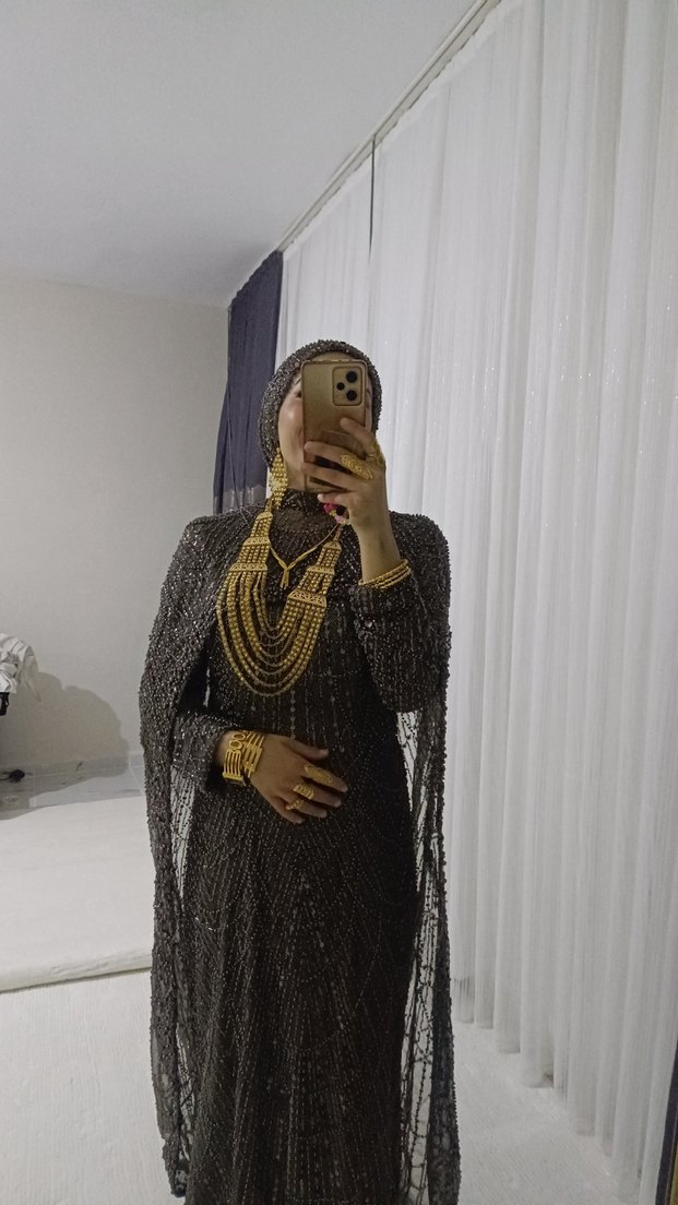 Yüksek yakalı, uzun kollu ve yılan desenli koyu altın renkli, boncuk işlemeli uzun ve vücuda oturan kadın elbisesi. Avant-garde bohem tarzda, düğünler için uygun. ✨