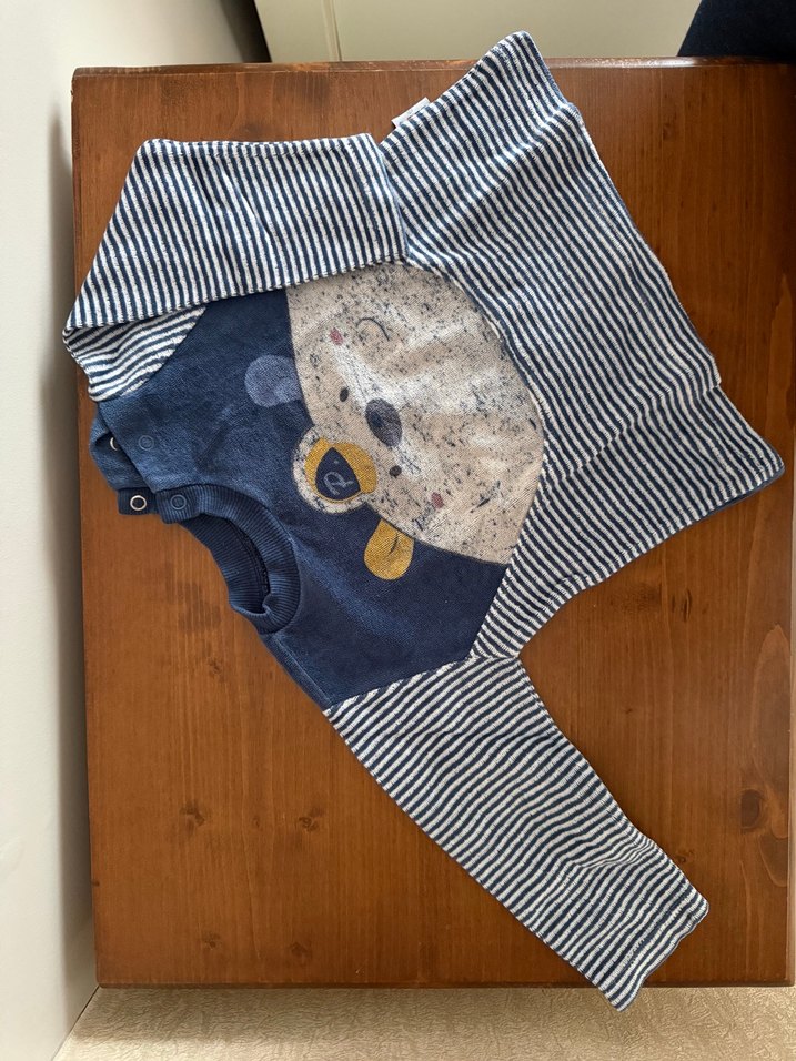 Uzun kollu, yuvarlak yakalı bebek takımı, ayı desenli ve düğmeli detaylı. Yumuşak sentetik kumaştan yapılmıştır, kahverengi ve çizgili desenli. Kadife