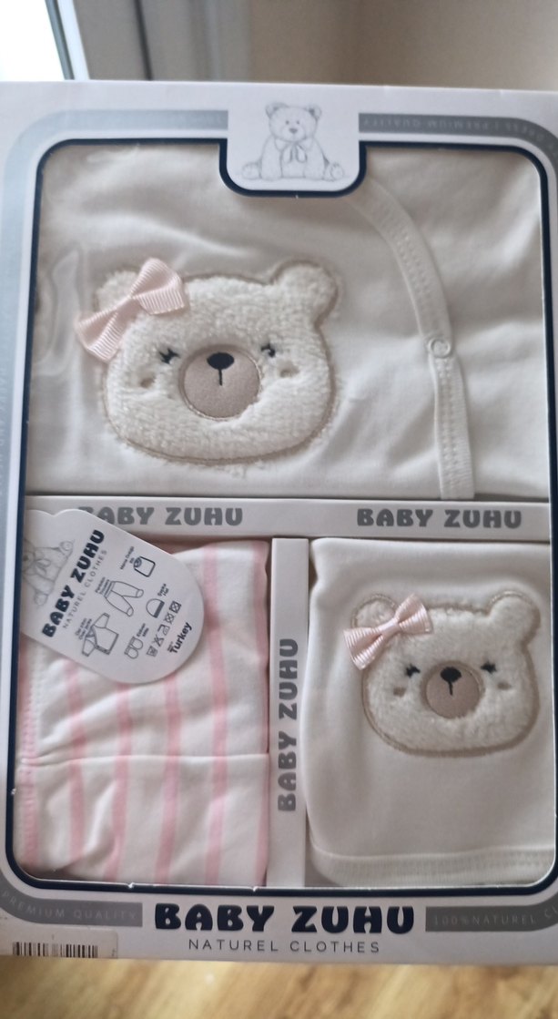 Pastel beyaz uzun kollu, düğmeli üstünde yumuşak ayıcık baskısı ve fiyonk detaylı bebek kız takımı. Çizgili pantolon ve uyumlu önlük içerir.