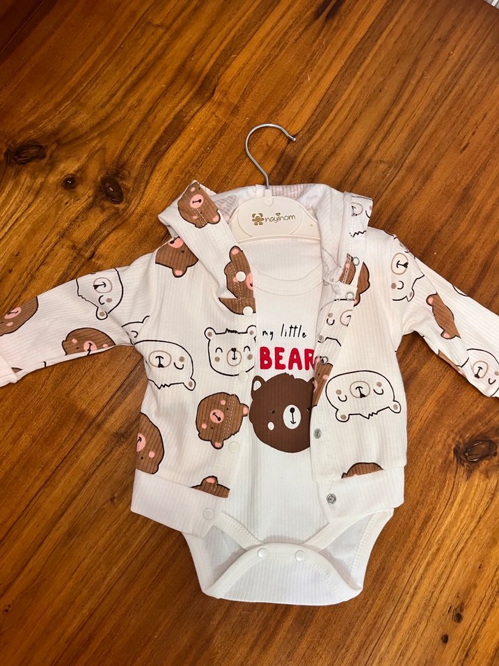 Bebek takımı uzun kollu ve bisiklet yaka, yumuşak ve sıcak kumaştan yapılmış açık kahverengi ayı desenli. Düğmeli detaylara ve "COCBEAR" baskısına sahiptir. 0-3/3-6/6-9 ay mevcut