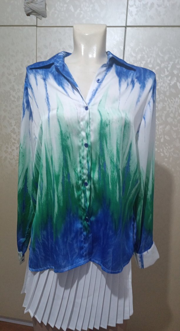 Kadın gömlek, uzun kollu ve V yakalıdır. Düğmeli önü ve uzun boyu vardır. Hafif çok renkli bağlama deseni bohem tarzını vurgular. Yumuşak sentetik kumaştan üretilmiştir. s m uyumludur kendi imalatımdır özel dikim