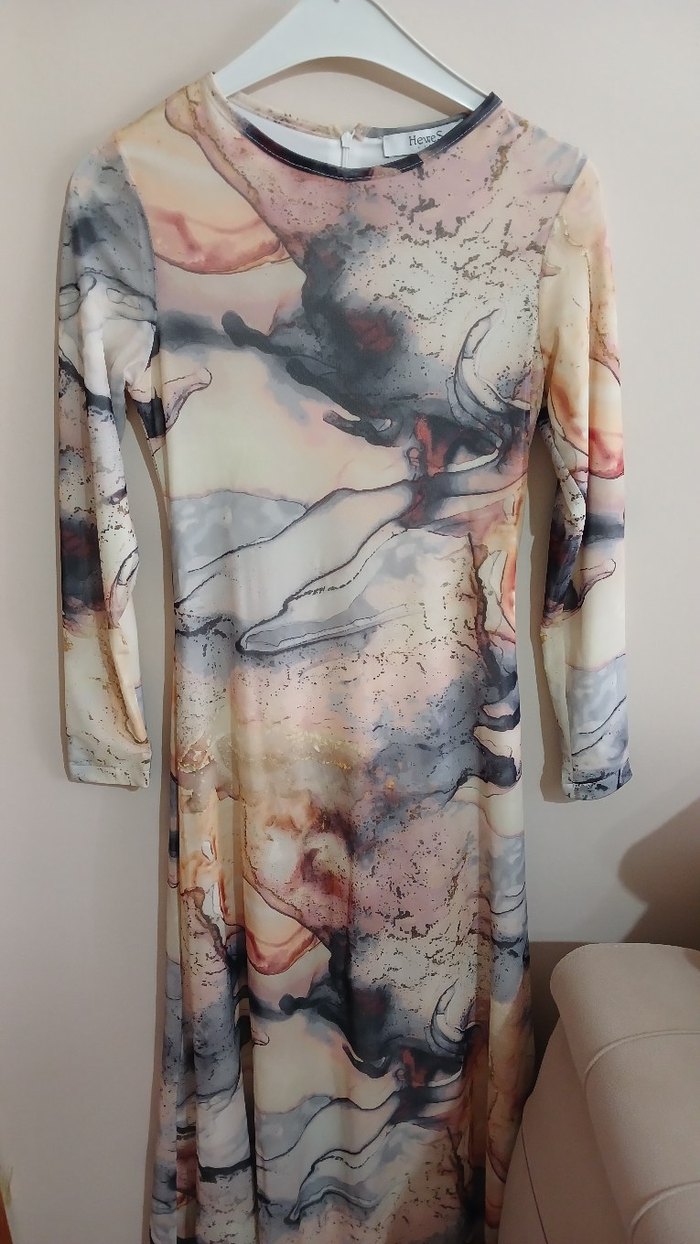 İpek görünümlü kumaştan, uzun kollu ve yüksek yakalı, pastel bağlama desenli, drapeli ve vücuda oturan uzun elbise. Bohem ve avangart tarzda, günlük kullanım için uygun.