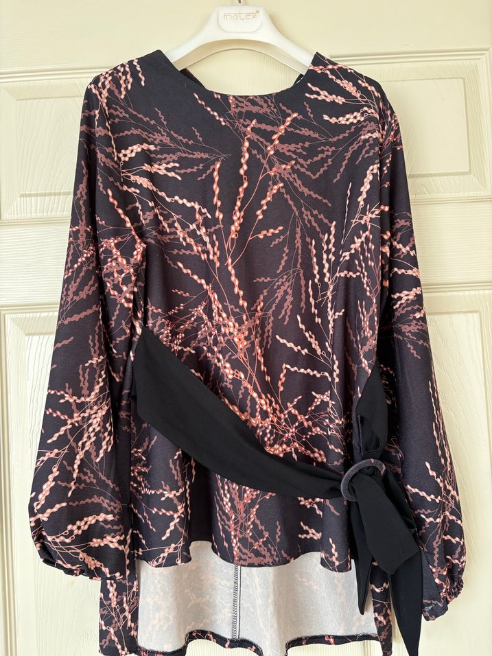 Uzun kollu, bol kesim ve yüksek yakalı bluz, koyu taba tonlarında bağlamalı drapeli batik deseniyle. Günlük kullanıma uygun, rahat ve modern tarzda.