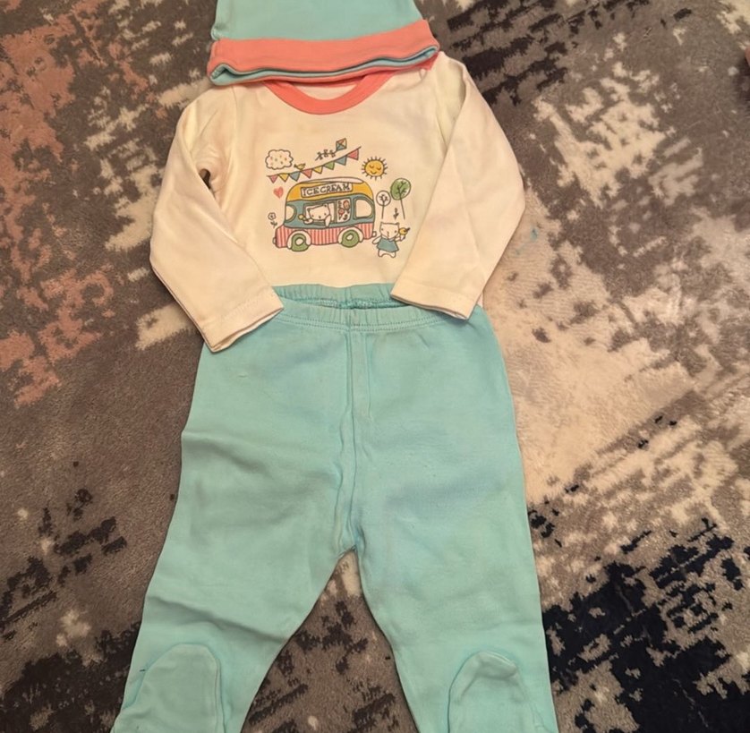 Uzun kollu, balıkçı yakalı üst ve yumuşak, pastel renkli pantolonlu bebek takımı. Sıcak ve rahat