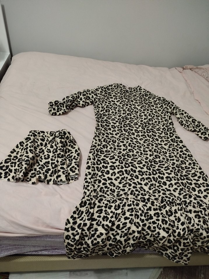 Uzun kollu, balıkçı yakalı ve yumuşak sentetik kumaştan yapılmış, koyu leopar desenli, vücuda oturan uzun elbise. Fırfır detayları bulunur, günlük sokak stili için uygundur.