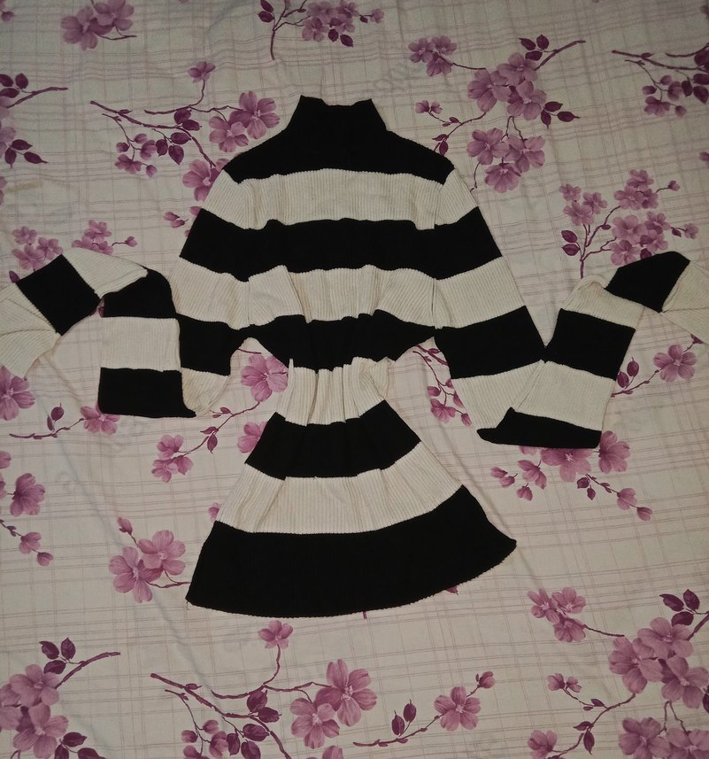 Uzun kollu, balıkçı yaka ve bol kesim örgü kazak. Zebra desenli, gotik ve rahat tarzda bir parça.