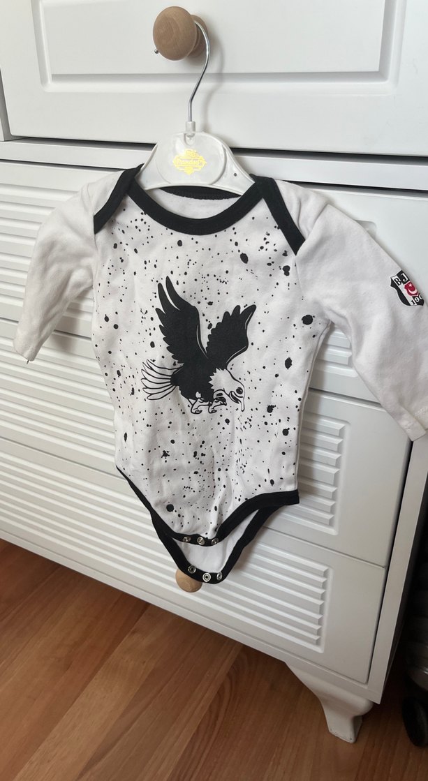 Uzun kollu, yuvarlak yakalı bebek body, siyah kartal baskılı beyaz ve gri benekli desende. Kolay giydirme için çıtçıtlıdır.