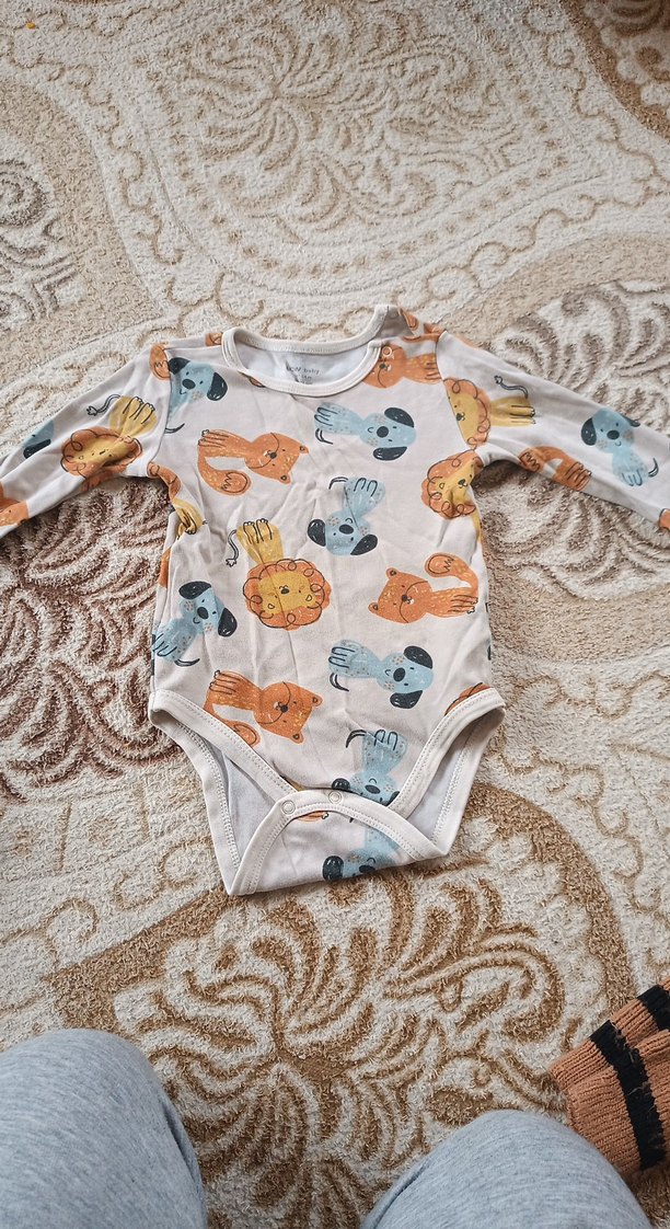 Uzun kollu, yuvarlak yaka ve yumuşak örgü kumaştan yapılmış bebek body. Pastel kahverengi zemin üzerinde renkli hayvan baskıları bulunur.