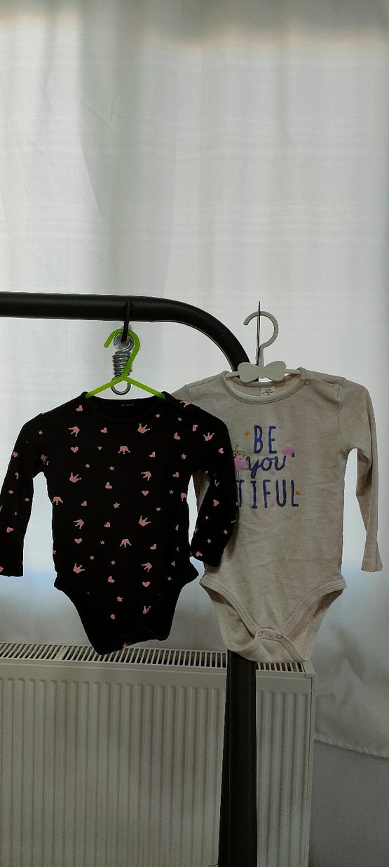 Uzun kollu, yuvarlak yakalı ve çıtçıtlı bebek body. Baskılı desene sahip, yumuşak ve rahat kumaş, gri renkte. az kullanılmış ikili fiyattır