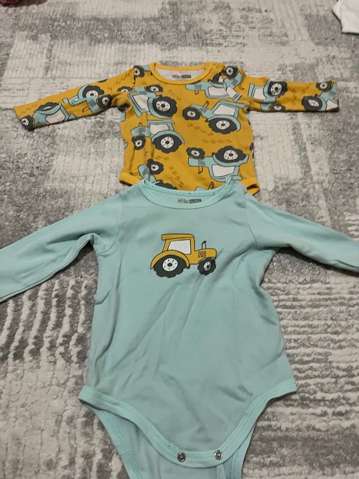 Pamuklu örgü kumaştan yapılmış, uzun kollu ve bisiklet yaka iki adet bebek body seti. Sarı baskılı ve mavi traktör desenli, pastel tonlarda sokak stili tasarım.