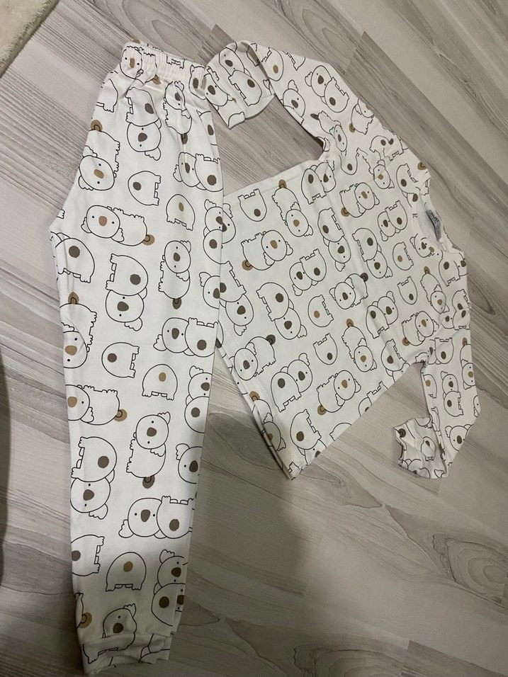 Beyaz ve gri, ayı desenli, uzun kollu, düğmeli ve yuvarlak yakalı yumuşak kumaştan bebek erkek takımı.