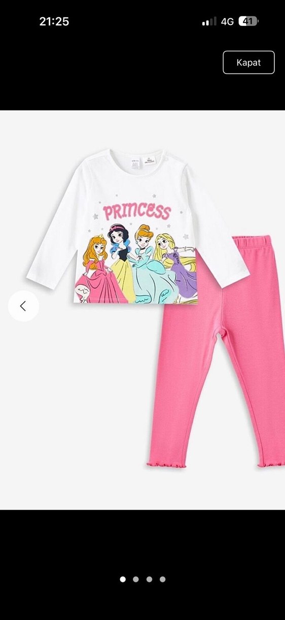 Uzun kollu üst kısmında renkli prenses baskısı ve pembe pastel tayt bulunan bebek kız takımı. Üstte "PRINCESS" yazısı yer alır.