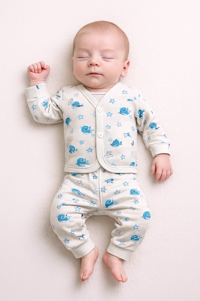 Beyaz zemin üzerine deniz canlıları desenli, uzun kollu, düğmeli V yaka üst ve eşofman altından oluşan yumuşak ve sıcak kumaş bebek takımı.