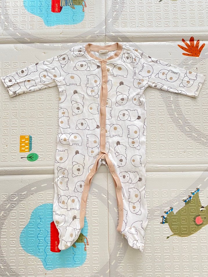 Uzun kollu, yuvarlak yaka ve düğmeli bu bebek tulumu yumuşak sentetik kumaştan üretilmiş olup, renkli hayvan baskıları ile süslenmiştir.