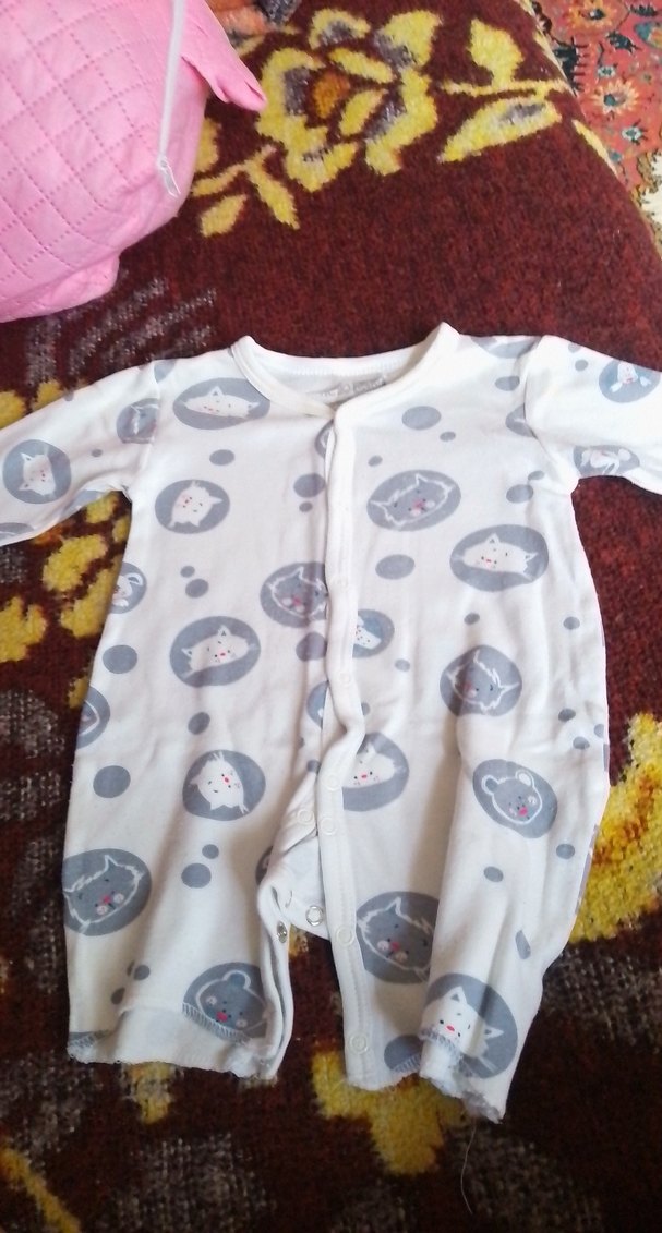 Uzun kollu, bisiklet yaka ve düğmeli bebek tulumu. Yumuşak ve sıcak kumaştan, beyaz zemin üzerinde gri baskılı hayvan desenleri bulunur.