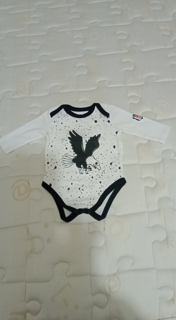 Beyaz uzun kollu bebek body, siyah kartal baskısı ve siyah yaka ile bacak açıklıklarına sahiptir. Yumuşak ve rahat kumaş kullanılmıştır.