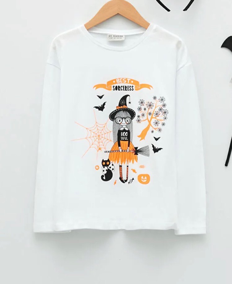 Pamuklu, uzun kollu beyaz kız tişörtü, renkli baskılı cadı temalı desen ve rahat bol kesim içerir. ♀️