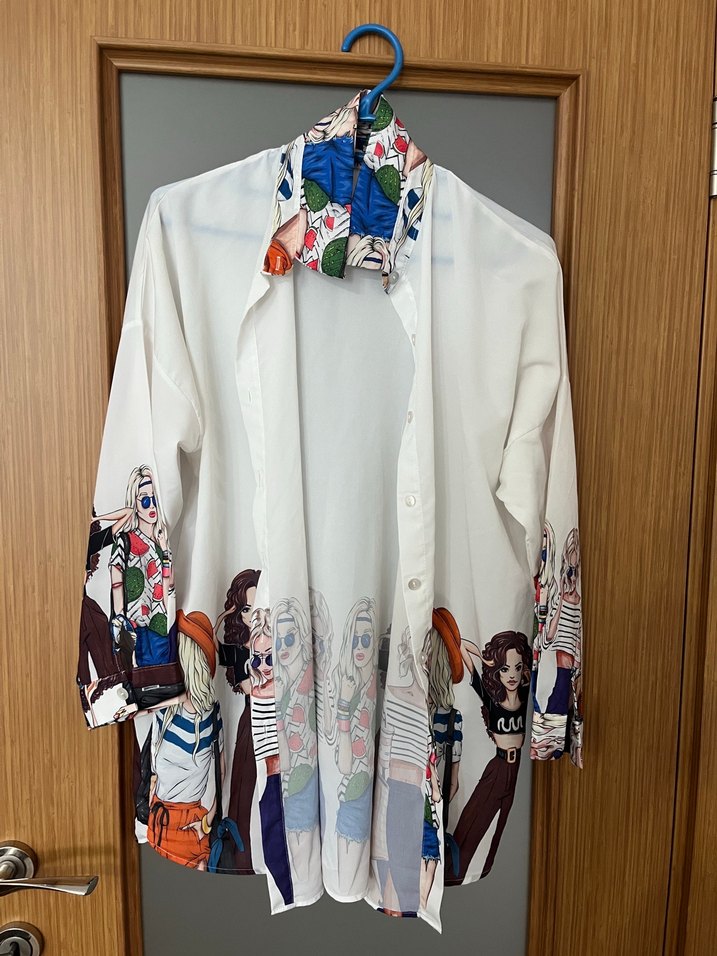 Beyaz uzun kollu gömlek, baskılı desenlere sahip, yakalı ve düğmeli. Bol kesim, bohem ve retro Paris tarzlarını yansıtır. Günlük kullanım için tekstil kumaş.