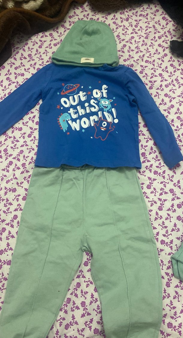 Uzun kollu, baskılı ve örme mavi üst, kaplumbağa yaka, yumuşak yeşil pantolon ve uyumlu şapka ile renkli erkek bebek takımı.