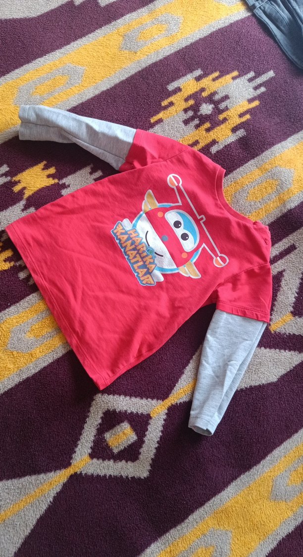 Kırmızı renkte, uzun kollu ve baskılı erkek çocuk tişörtü. Rahat kesimli, yuvarlak yaka ve yumuşak dokulu örgü kollara sahiptir.