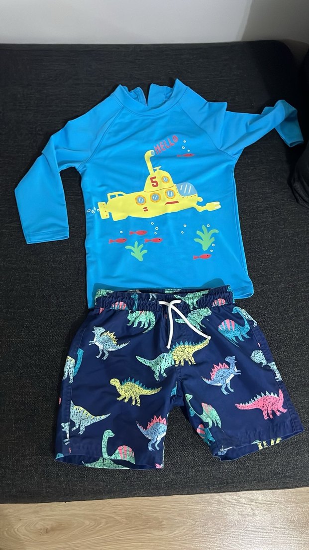 Uzun kollu, mavi üstü renkli denizaltı baskılı, lacivert şortları canlı dinozor desenli erkek mayo takımı
