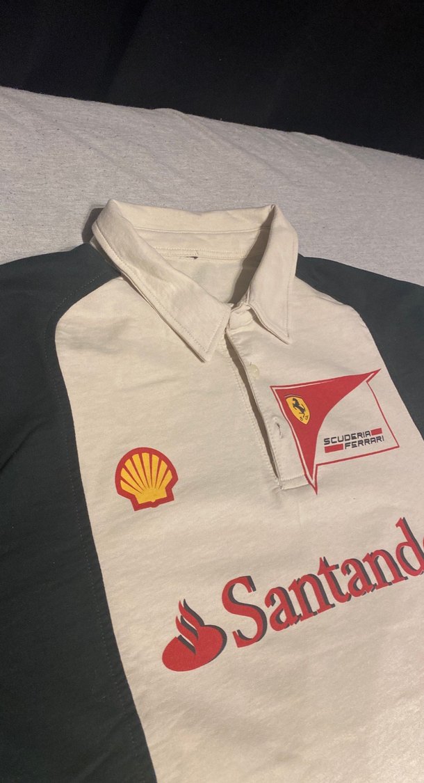 Uzun kollu, düğmeli yakalı beyaz ve gri baskılı erkek polo tişört. Sentetik kumaştan, normal kesim ve günlük rahat stil için uygundur.