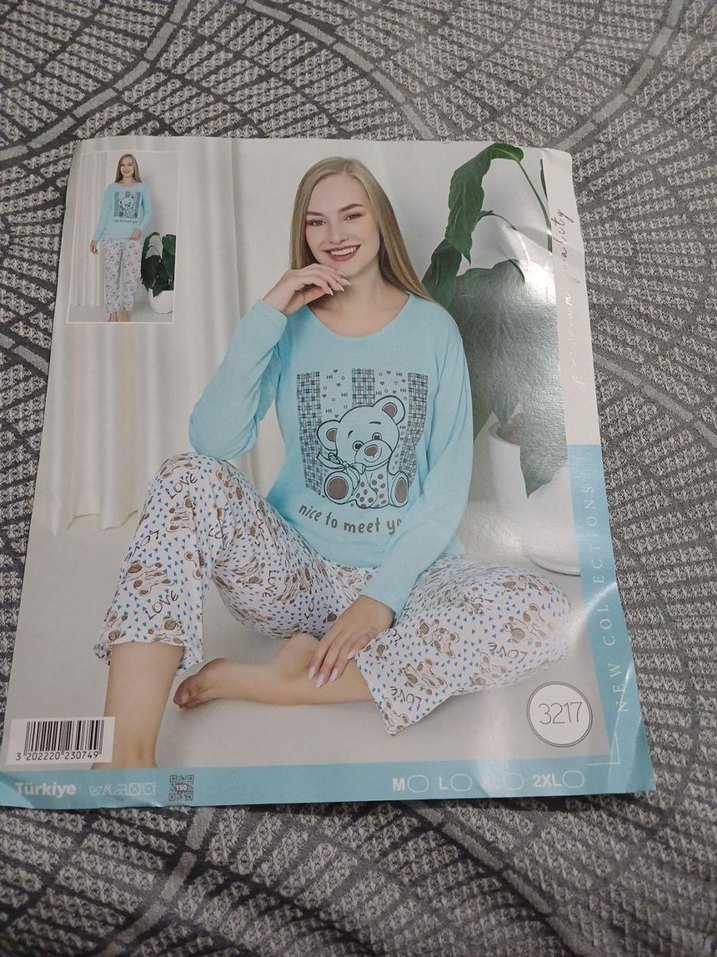 Uzun kollu, bol kesim kadın pijama takımı. Üstü pastel mavi, üzerinde sevimli ayı baskısı var. Rahat ve konforlu desenli pantolonla tamamlanmıştır.