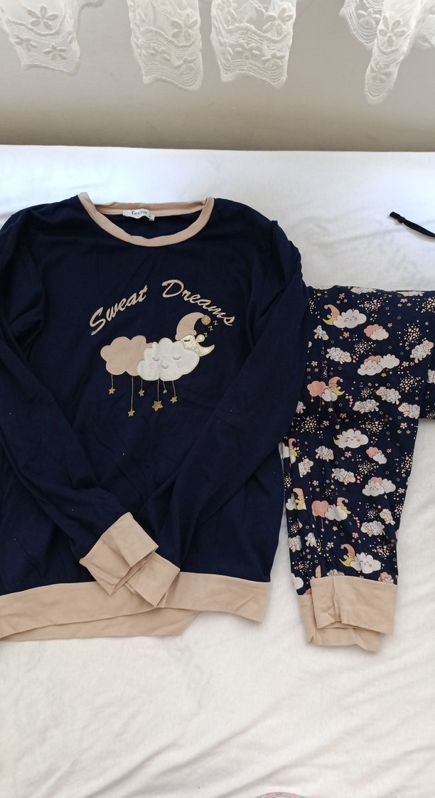 Kadınlar için uzun kollu, bol kesim pijama takımı. Üstte bulut ve ay baskısı ile 'Sweet Dreams' yazısı, alt ise bulut ve yıldız desenli, bej detaylıdır. Rahat ve konforlu.(yeni gibi birkaç kez giyildi)