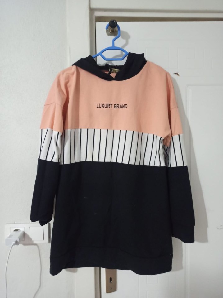 Uzun kollu, yuvarlak yakalı ve bol kesim kadın sweatshirtü. Sentetik kumaştan örülmüş, açık pembe, siyah ve beyaz çizgili desenlere sahip. Önünde "LUXURT BRAND" baskısı bulunur.
