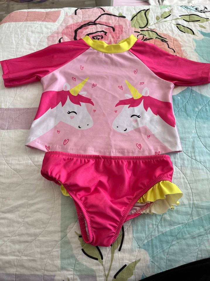 Uzun kollu, renkli unicorn baskılı kız çocuk mayo üstü ve sarı fırfırlı pembe bikini altından oluşan mayo takımı.