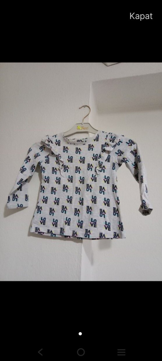 Beyaz uzun kollu kız çocuk tişörtü, yuvarlak yaka ve bol kesimlidir. Sentetik kumaştan üretilmiş, baskılı yazılar ve fırfır detayları vardır.