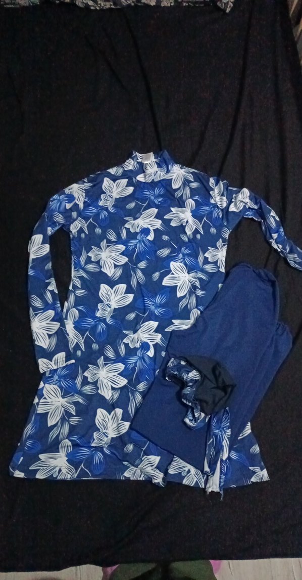 Uzun Kollu Baskılı Mavi çiçek desenli üçlü takım haşema