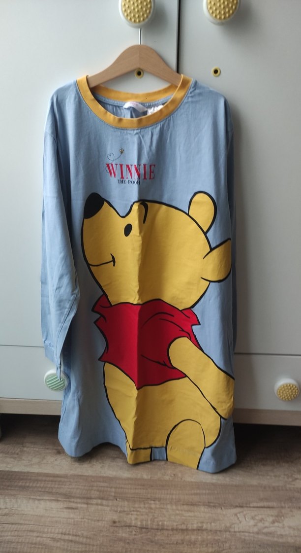 Renkli mavi, uzun kollu, yuvarlak yakalı ve bol kesim emzirme geceliği. Midi boy ve Winnie the Pooh baskılıdır.