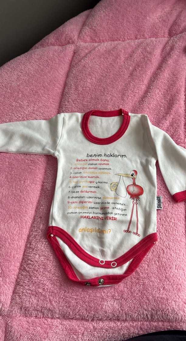 Pembe, uzun kollu, bisiklet yaka ve örme dokulu bebek body. Önünde baskılı yazı ve çizim bulunur. Canlı pastel renkler içerir.
