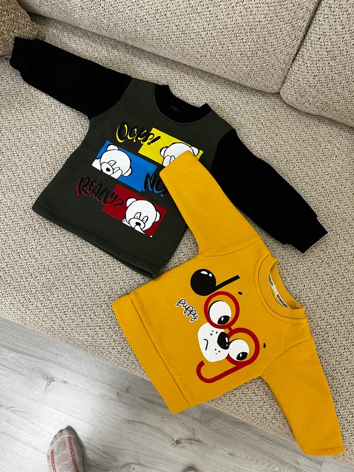 Uzun kollu, bisiklet yakalı iki renkli bebek erkek sweatshirt. Biri sarı ve köpek yüzü baskılı, diğeri koyu zemin üzerine çizgi film karakteri baskılı. Yumuşak örme kumaştan üretilmiştir.