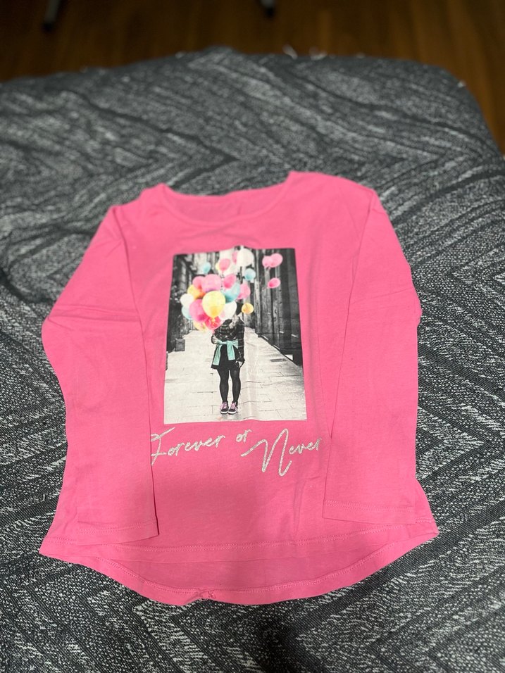 Pamuklu kumaştan yapılmış, bol kesim ve bisiklet yakalı, renkli baskılı uzun kollu pembe kız tişörtü.